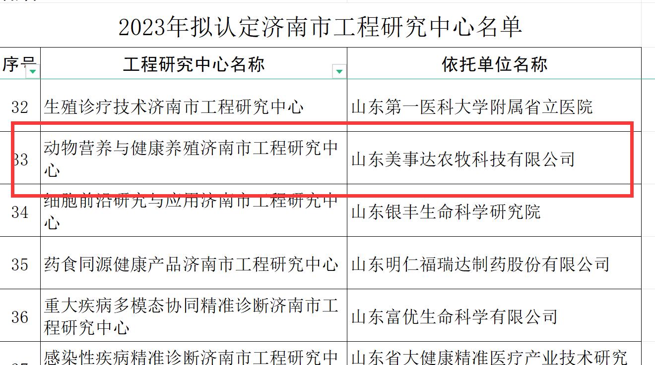 ? ? 近日,濟南市發(fā)展與改革委員會公示了“2023年濟南市工程研究中名單”,山東美事達農(nóng)牧科技有限公司被認定為“動物營養(yǎng)與健康養(yǎng)殖濟南市工程研究中心”。