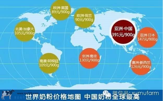 2、全球的嬰幼兒奶粉(900克罐裝1段為例) 平均售價:120元/人民幣