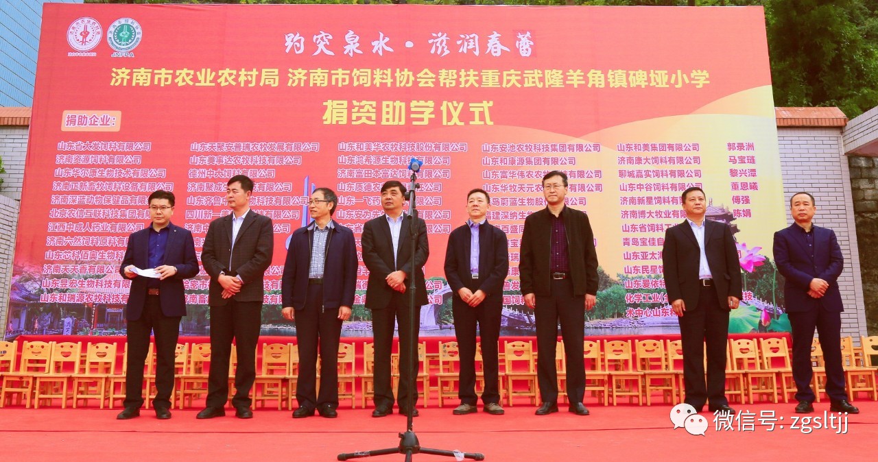? 10月31日上午,“趵突泉水?滋潤春蕾”捐資助學儀式在碑埡小學校內舉行,武隆區副區長李廣華主持儀式,武隆區人大常委會副主任涂華林、武隆區人民政府黨組成員張允峰、濟南市農業農村局局長李季孝、二級巡視員付良玉、總畜牧師宋長明、濟南市飼料協會會長簡政等領導和嘉賓出席儀式。